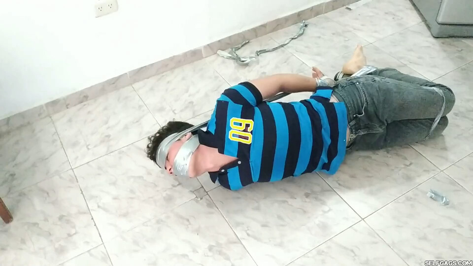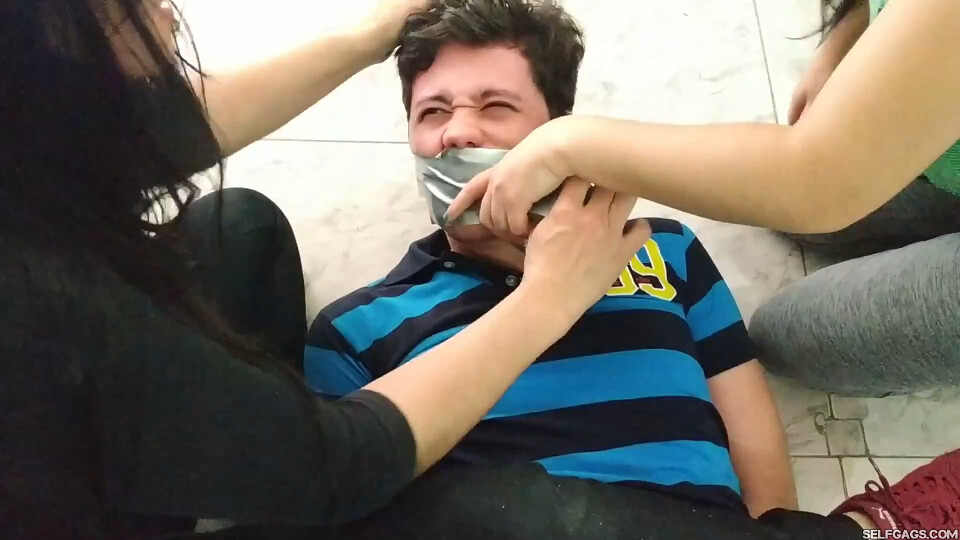 Now it’s his turn to be gagged, humiliated, and hogtied. Laura and Katherine strip him of his control, shove a used pair of panties in his mouth, and seal it tight with a thick tape wrap gag. They tape his wrists, ankles, and body into full restraint, then mock and tease him as he squirms, grunts, and struggles, completely at their mercy.