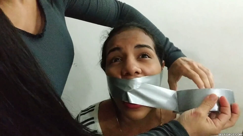 Maria finds herself duct-taped to a chair next to Dario. Laura stuffs a piece of cloth into Maria’s mouth and tightly wraps duct tape around it, effectively gagging her, before giving Dario a similar gag. Both Maria and Dario are now heavily tape-gagged, stuck, and moaning side by side.