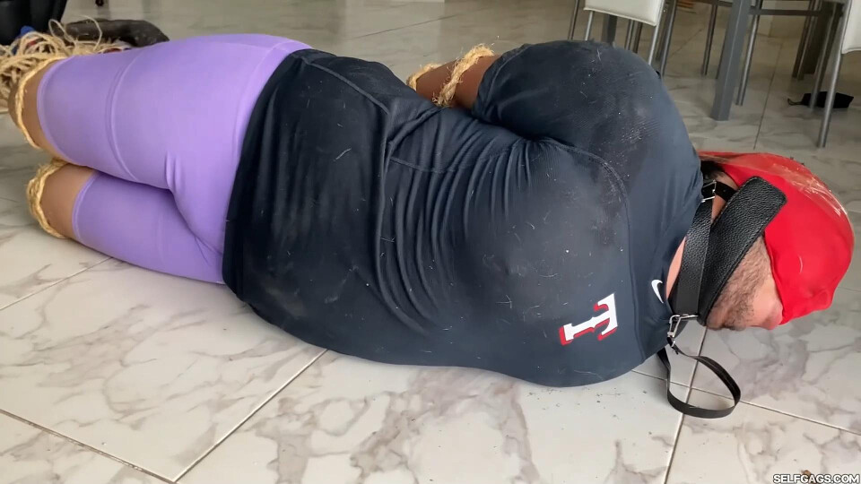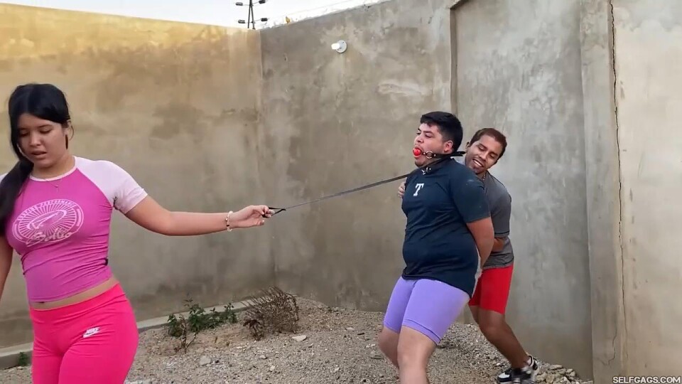 The punishment continues. Still tied and ballgagged outdoors, Felipe begs for mercy — but Franco’s small kindness only lasts a moment. Soon, Mary returns to unleash a new round of bondage. Felipe is collared, leashed, and marched into the house where he’s roped even tighter: elbows pinned, wrists and ankles bound, legs cinched together. Humiliated and drooling behind his gag, he’s made to sniff Mary's sweaty feet before being taped into a ruthless folded hogtie position with pantyhose wrapped over his head. The psycho ex is far from done.