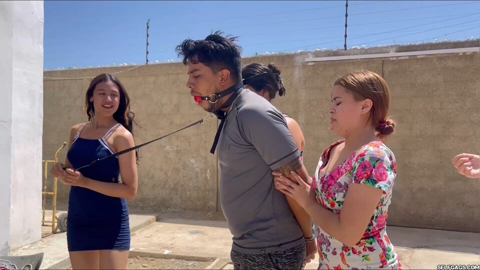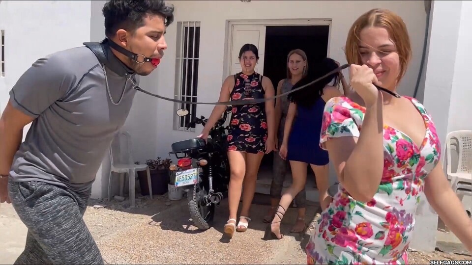 At a girls-only femdom party, Mistress Yurca brings out her collared, ball-gagged slaveboy Franco as the ultimate party pet for her friends Xandra, Mary, and Khloe. Each dominant woman takes turns walking Franco on his leash around the yard before deciding to make things harder by taping his ankles and legs together.