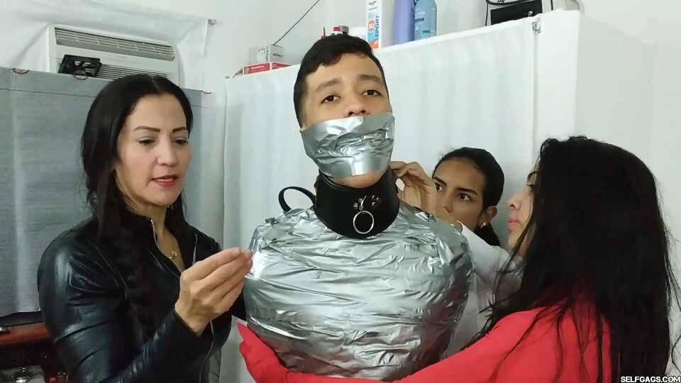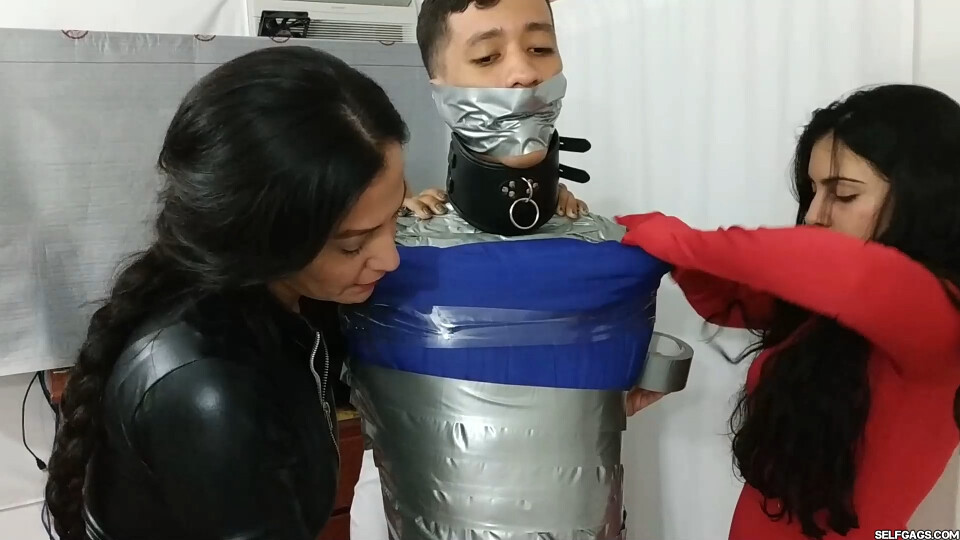 Included in this clip: femdom mummification, latina femdom, duct tape bondage, submissive latino, panty gagged male, tape gagged guy, tight wrap gag, bondage collar, handcuffed male, clear tape encasement, encasement bondage, leotard femdom, catsuit femdom, multilayered bondage, gagged and bound, gagged latino, femdom bondage trio, bdsm mummification, panty hood, 18-year-old submissive