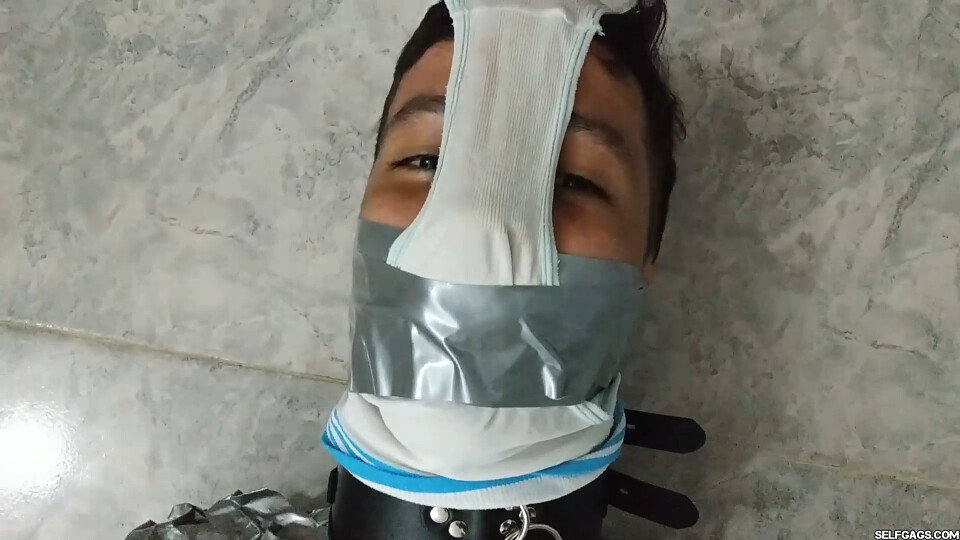Lucas is panty gagged and tightly tape cleave gagged, which is soon reinforced with a full wraparound tape gag. A leather collar is secured to his neck as the women continue layering packing tape, duct tape, and a napsack, leaving Lucas sweat-soaked and completely immobilized.