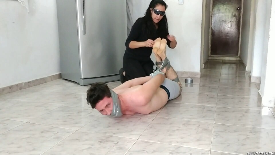 A typical lazy home-alone boy falls into the binding claws of a sexy Latina MILF catburglar who takes great pleasure in binding, gagging, and tickling the feet of the bound and gagged boy!