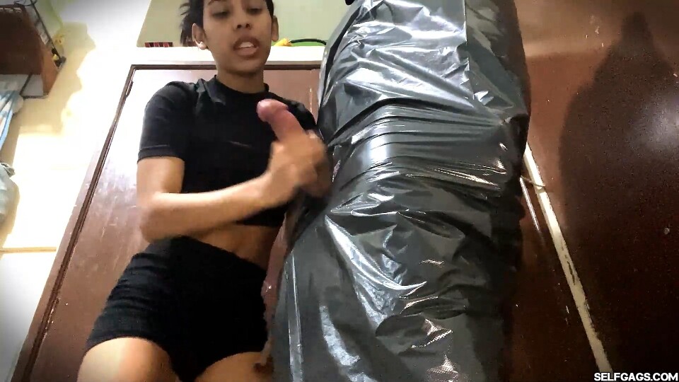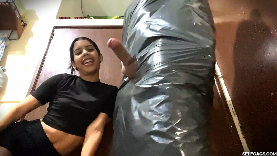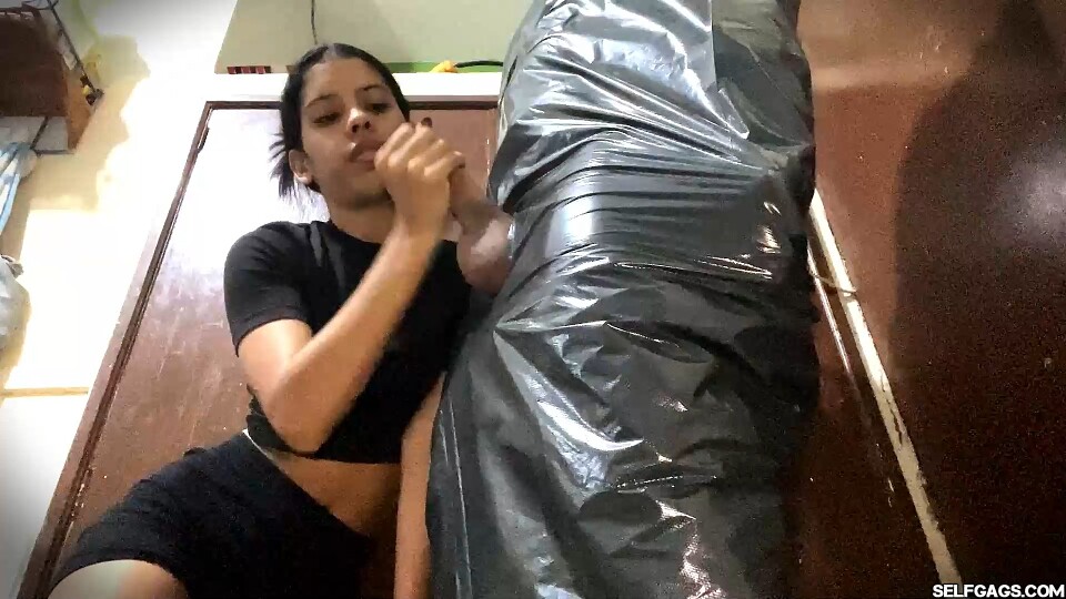 This intense femdom scene explores themes of dominance, erotic control, and sensory teasing between Diana and Nicolas. In a dimly lit room, Nicolas stands fully restrained, tightly wrapped in black plastic with only his erect genitals exposed, highlighting his vulnerability in this BDSM setting. His gagged mouth muffles any sounds, amplifying his helplessness and adding suspense to the scene.