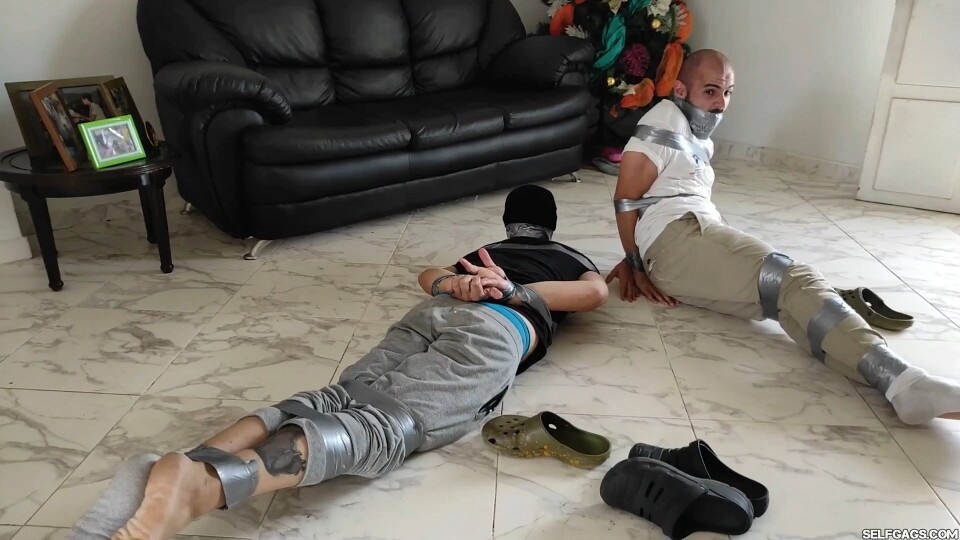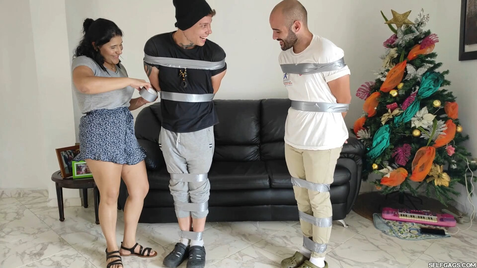 Nina Naranjo is hanging out with her two friends Hector and Alejandro. She dares them for an escape challenge to see who can escape their duct tape ties the fastest. The boys accept the challenge and get tied up by Nina! Hector and Alejandro are struggling side by side on the floor and to Nina's amusement, they realize that they can't get out. Nina sits between her two stuck boys and does a nice and tight double handgag on them while she laughs at them!