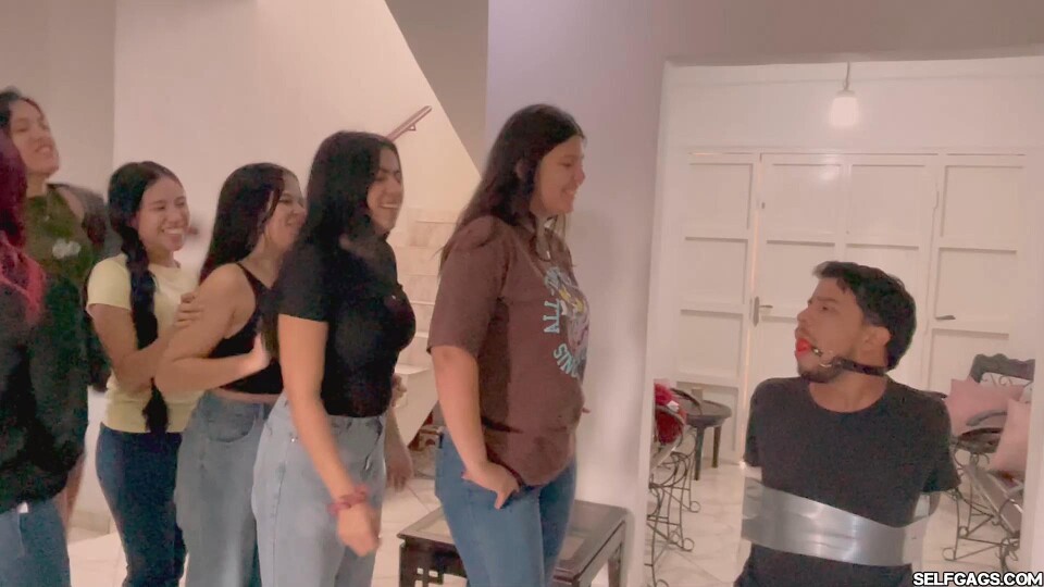 In this thrilling scene, Franco is securely tied to a chair with duct tape and starts with a red ball gag in his mouth. A lively group of six girls — Barby Luna, Penélope Garcia, Mary Macaya, Laika Labado, Xandra, and Yurca —take turns hand gagging him in a playful yet intense "hand gag squad" session. Each girl presses her palm firmly over Franco's mouth, creating muffled sounds and adding to the tension. The session escalates as the girls apply hand lotion for a slicker experience during the second round. Finally, the scene concludes with a dramatic twist: duct tape is wrapped tightly around Franco’s mouth, followed by synchronized hand gags by all six girls at once for an unforgettable climax. Perfect for fans of hand gags, duct tape gags, and creative restraint scenarios, this clip combines teamwork, laughter, and suspense with detailed close-ups and dynamic interactions. Don’t miss this unique blend of fun and tension!