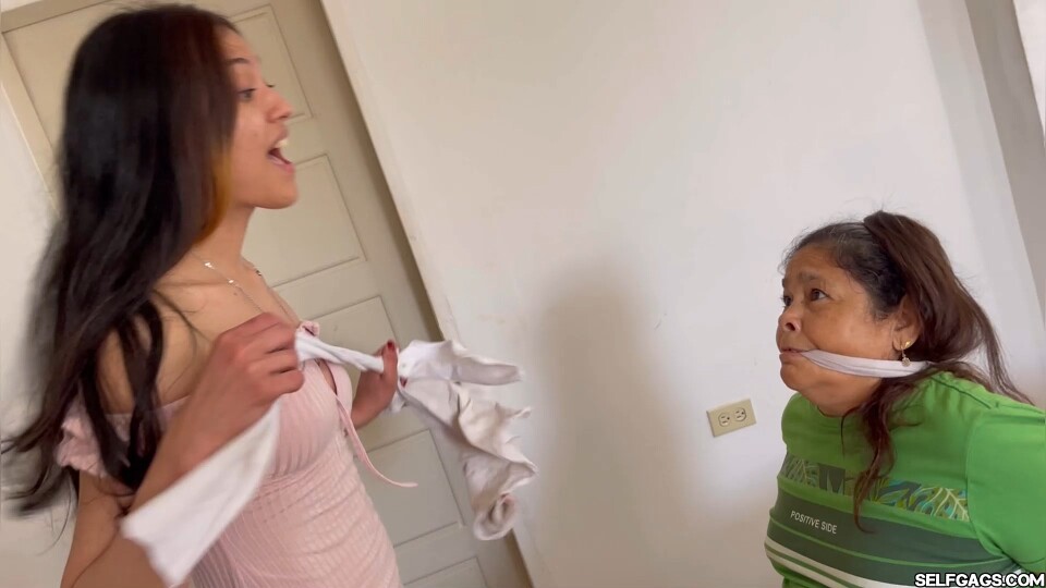 Yurca, a dominant woman, is hired by Franco for a bondage session at his home. When she arrives, she’s greeted by the house cleaner, Agata, as Franco isn’t home yet. Yurca explains her purpose, and Agata, intrigued by the idea, agrees to be tied up while they wait for Franco. Yurca quickly takes charge, blindfolding her with a scarf, and leading her upstairs to a bedroom. There, Yurca gags Agata by cleave gagging her with the scarf used as blindfold, then tying 2 OTM gags on top of it. Then Yurca continues binding her tightly with ropes, leaving Agata in a vulnerable and restrained hogtie position on the bed!